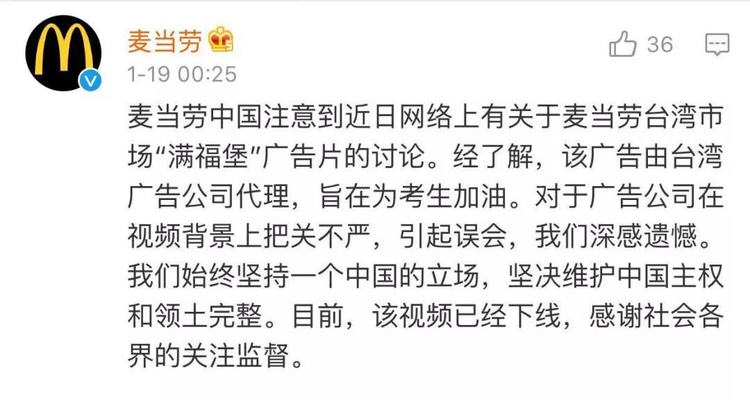 【关注】广告主角“国籍”写“台湾”,麦当劳深夜“表示遗憾”
