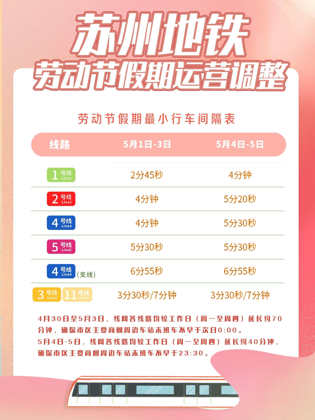 小伙伴们注意啦劳动节期间苏州轨道交通运营有调整 具体来看 ↓延长线网运营服务时间1.4月30日至5月3···